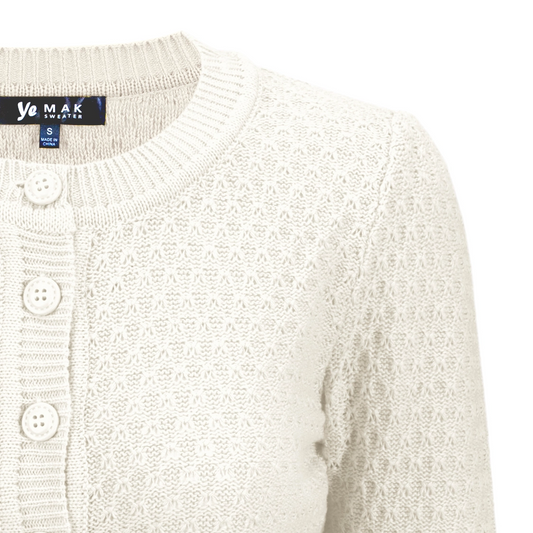MAK 3/4 Sleeve Crewneck Knit Crochet Pattern Cropped Cardigan - Ivory