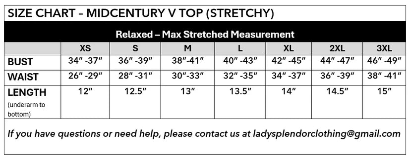 Introducing the Midcentury V Top - a must-have piece for all lovers of vintage and retro style. The plunging V neckline is versatile, perfect for both on and off the shoulder wear. With no closures or zipper, it's effortless to slip on. Made from soft yet strong Ponte fabric, this top offers both comfort and durability.
