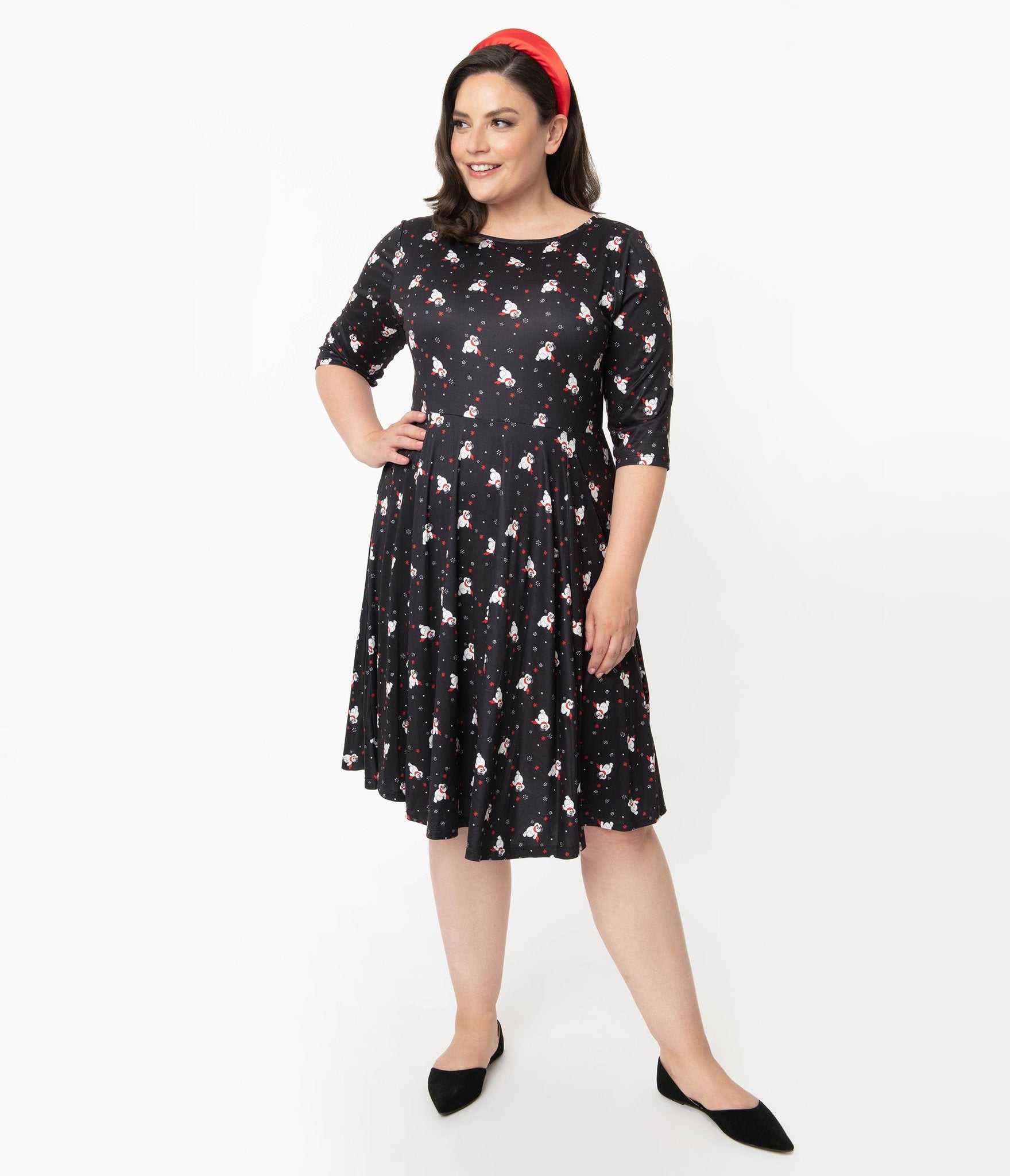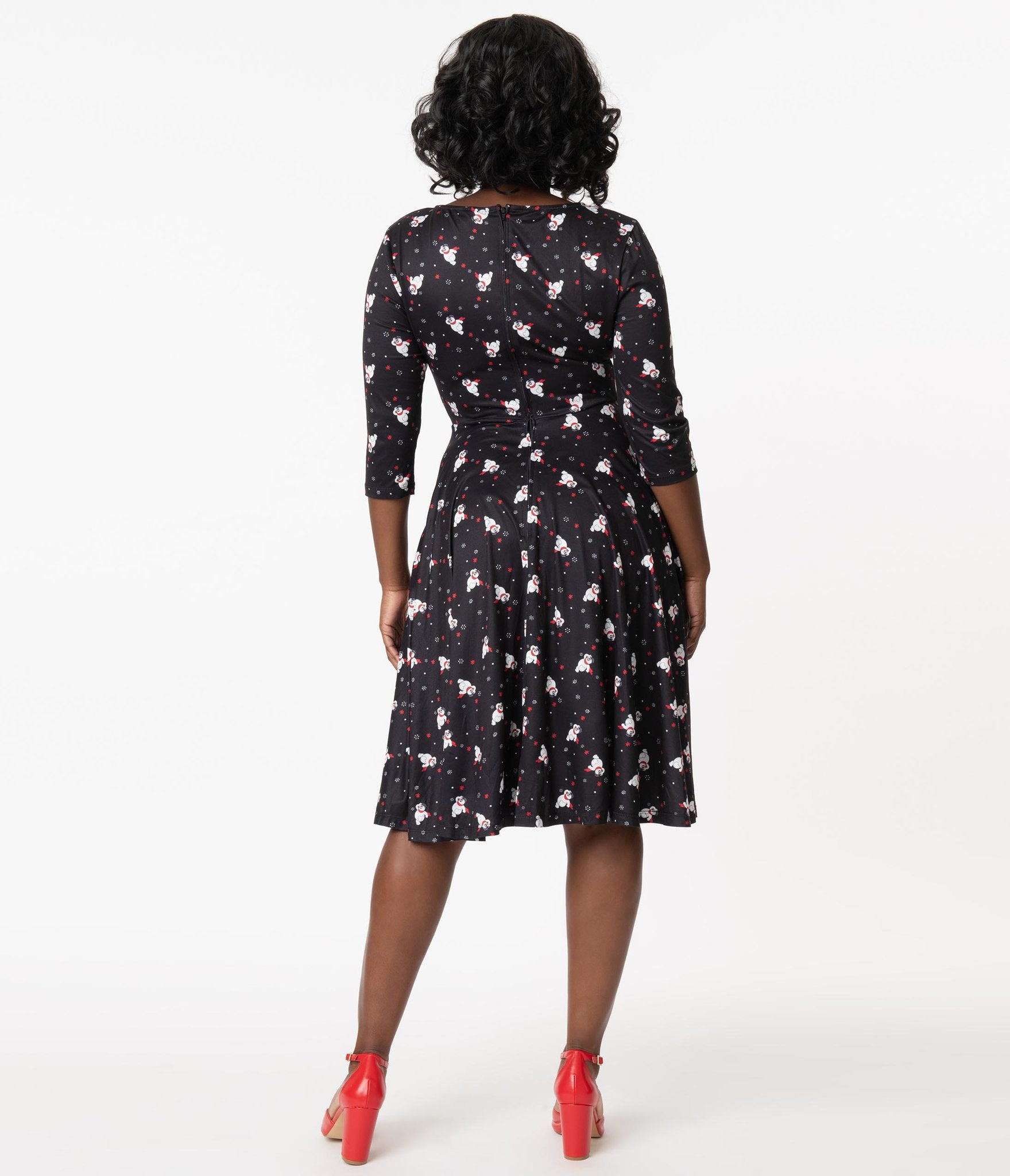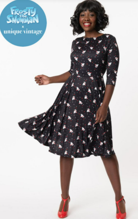 Dreaming of magical snowflakes, dames? In a sweet collaboration with Frosty the Snowman, the Nicole Dress is a charming piece for a snow day from Unique Vintage! Crafted in a soft knit blend, this modest look features Frosty the Snowman running through snowflakes and red magic stars as they cascade through a black backdrop and three-quarter sleeves for a truly retro touch. The seamed waist and sleek A-line swing skirt bring a feminine flare you'll find irresistible. Complete with a hidden back zipper and hook, your perfect look is sure to turn heads!